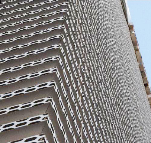 板面是規律排列的菱形孔,形狀如同長城。這種沖孔長城鋁單板是汽車4S店外墻裝飾指定使用的材料,因裝飾視覺效果好、防火、耐用性強及安裝方便等特點而被越來越多的建筑廣泛使用。
