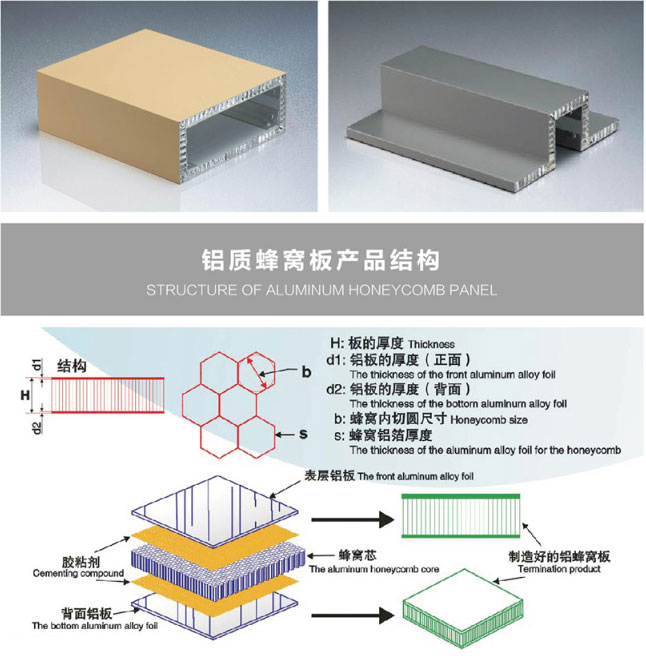鋁蜂窩鋁單板是采用經氟碳噴涂處理的耐候性極佳的高強度合金鋁板作為面、底板,中間是鋁蜂窩芯,經高溫高壓復合而成的蜂窩式夾層結構板材。具有質輕、強度高、鋼性好、隔音、隔熱等特點。鋁蜂窩板是航空、航天材料,目前已逐步發展應用于民用領域,如建筑業、交通工業、廣告牌等行業。本公司引進先進的全自動連續復合生產線,采用冷膠和熱復合相結合技術,使產品達到先進水平,同時豐富多彩的造型板能充分實現建筑師完美的創意。