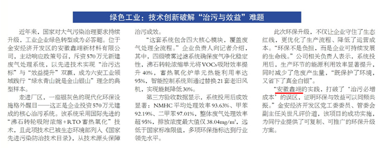 近日,**《六安新周報》**刊發專題報道《綠色工業:技術創新破解“治污與效益”難題》,聚焦安徽鑫翊新材料有限公司在綠色發展道路上的實踐與探索。報道指出,安徽鑫翊打破了“治污必然增加成本”的傳統誤區,證明環保與效益完全可以同頻共振。
